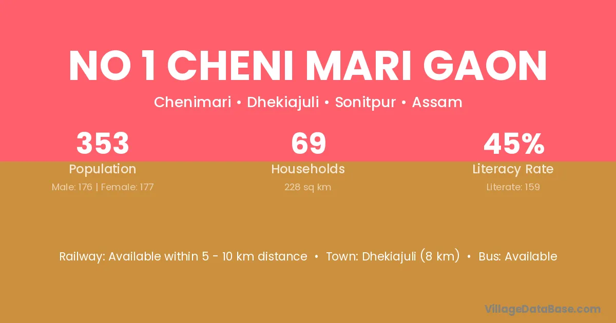No 1 Cheni Mari Gaon village has a total population of 353 people, of which 176 are males and 177 are females.