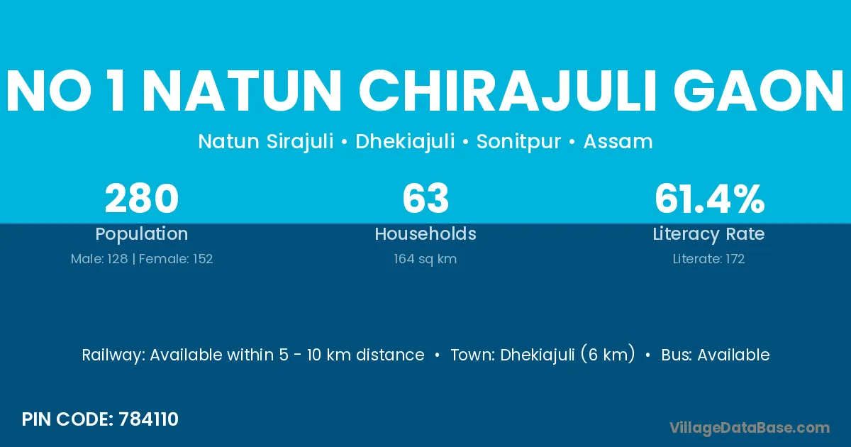 No 1 Natun Chirajuli Gaon village has a total population of 280 people, of which 128 are males and 152 are females.