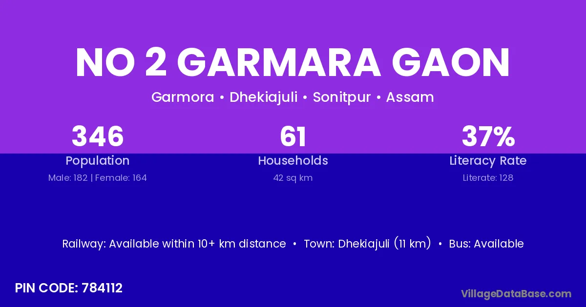 Dhekiajuli (11 km) is the nearest town to No 2 Garmara Gaon village for major economic activities and is located approximately 11 km away.
