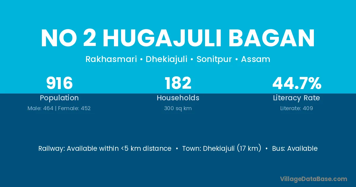 Dhekiajuli (17 km) is the nearest town to No 2 Hugajuli Bagan village for major economic activities and is located approximately 17 km away.