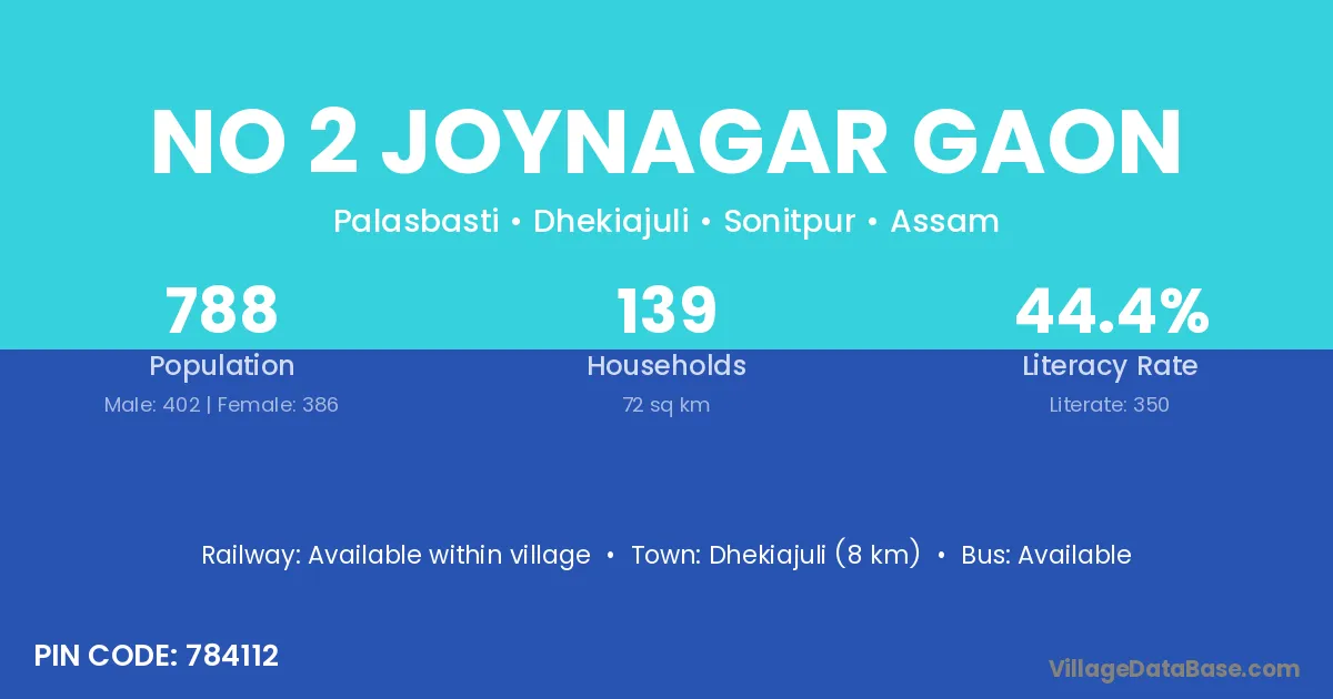 Dhekiajuli (8 km) is the nearest town to No 2 Joynagar Gaon village for major economic activities and is located approximately 8 km away.