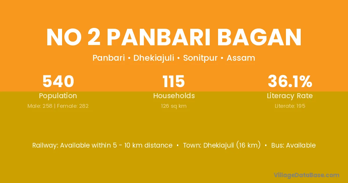 Dhekiajuli (16 km) is the nearest town to No 2 Panbari Bagan village for major economic activities and is located approximately 16 km away.