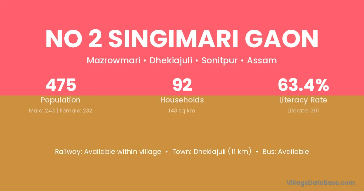 No 2 Singimari Gaon village has a total population of 475 people, of which 243 are males and 232 are females.