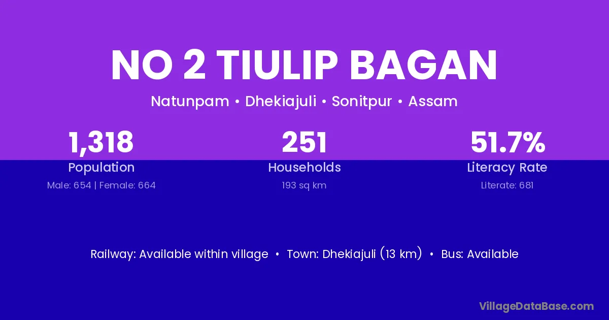 Dhekiajuli (13 km) is the nearest town to No 2 Tiulip Bagan village for major economic activities and is located approximately 13 km away.