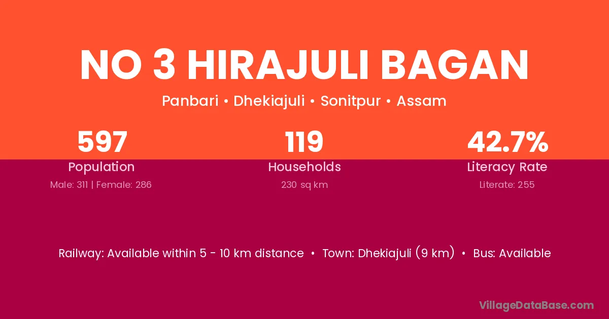 Dhekiajuli (9 km) is the nearest town to No 3 Hirajuli Bagan village for major economic activities and is located approximately 9 km away.