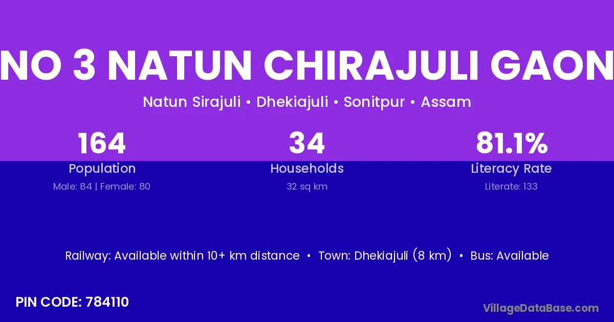 No 3 Natun Chirajuli Gaon village has a total population of 164 people, of which 84 are males and 80 are females.