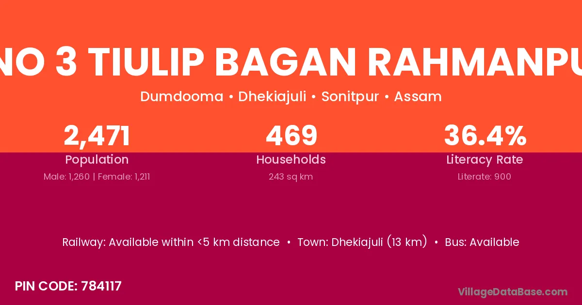Dhekiajuli (13 km) is the nearest town to No 3 Tiulip Bagan Rahmanpu village for major economic activities and is located approximately 13 km away.