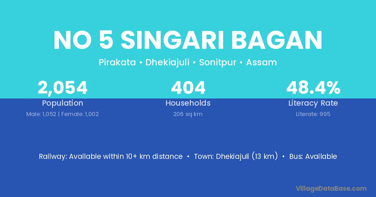 Dhekiajuli (13 km) is the nearest town to No 5 Singari Bagan village for major economic activities and is located approximately 13 km away.