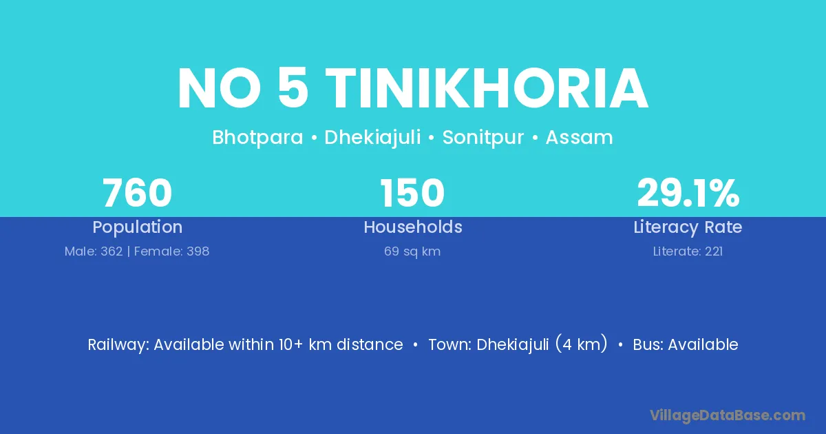 Dhekiajuli (4 km) is the nearest town to No 5 Tinikhoria village for major economic activities and is located approximately 4 km away.