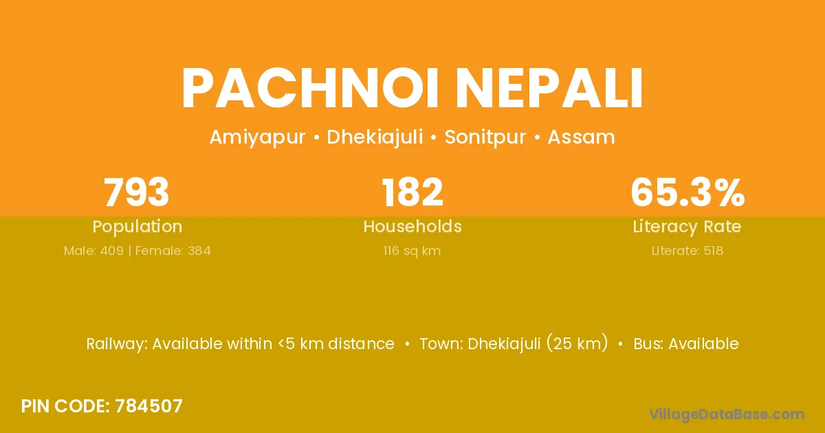 Dhekiajuli (25 km) is the nearest town to Pachnoi Nepali village for major economic activities and is located approximately 25 km away.