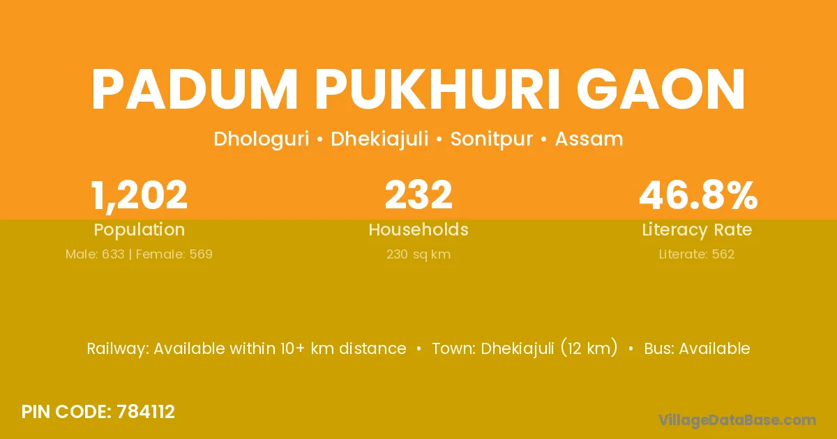 Padum Pukhuri Gaon village has a total population of 1,202 people, of which 633 are males and 569 are females.
