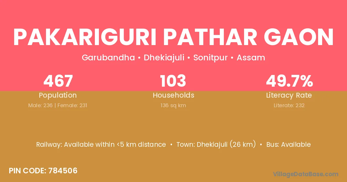 Pakariguri Pathar Gaon village has a total population of 467 people, of which 236 are males and 231 are females.