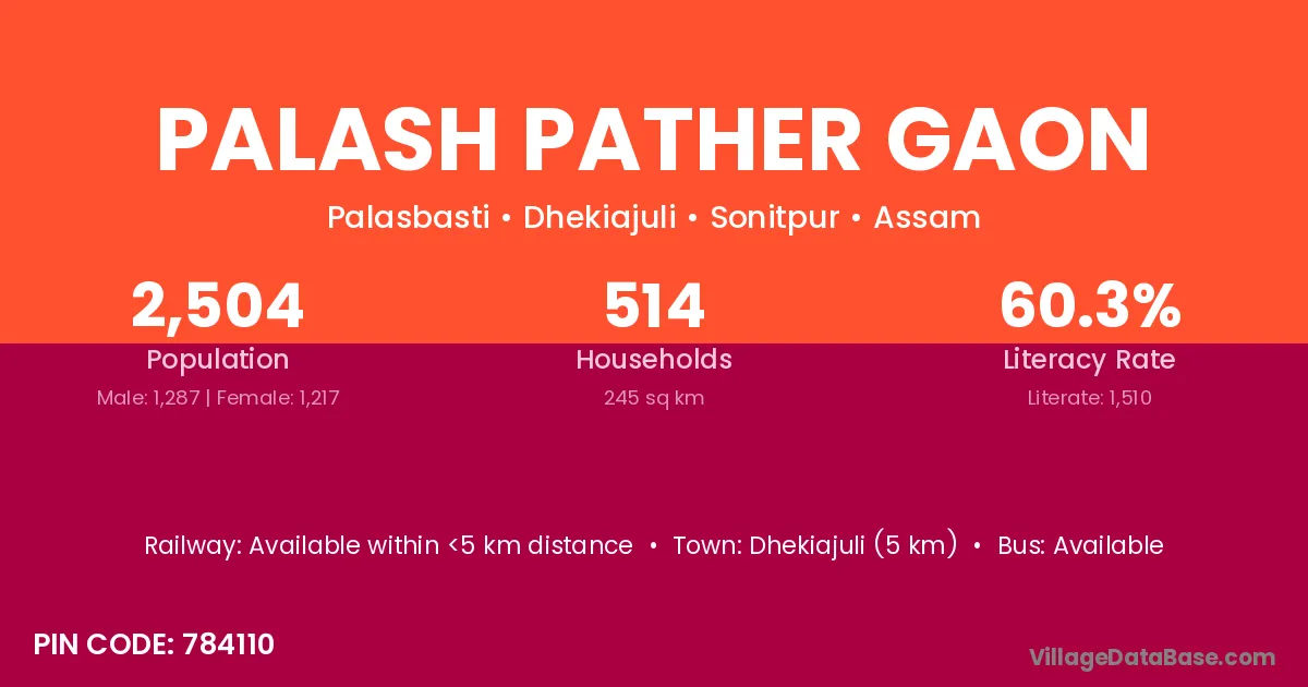 Dhekiajuli (5 km) is the nearest town to Palash Pather Gaon village for major economic activities and is located approximately 5 km away.