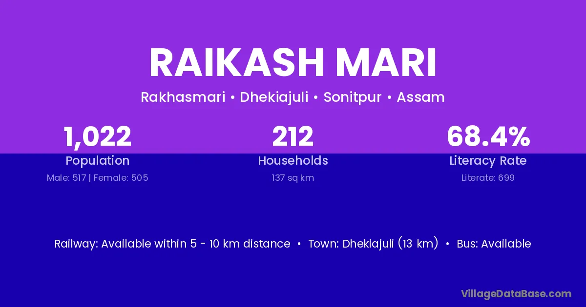 Dhekiajuli (13 km) is the nearest town to Raikash Mari village for major economic activities and is located approximately 13 km away.