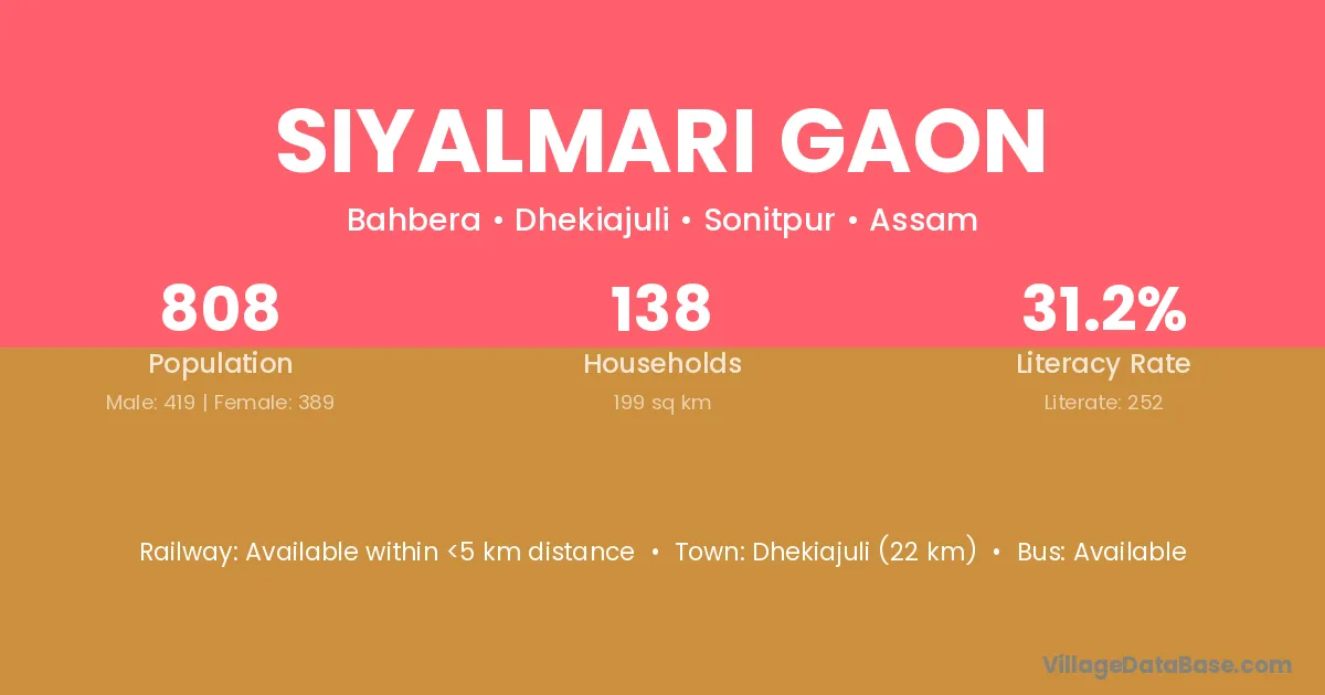 Dhekiajuli (22 km) is the nearest town to Siyalmari Gaon village for major economic activities and is located approximately 22 km away.
