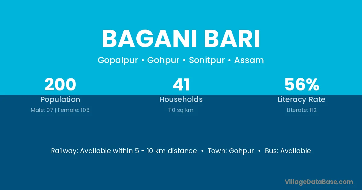 Bagani Bari village has a total population of 200 people, of which 97 are males and 103 are females.