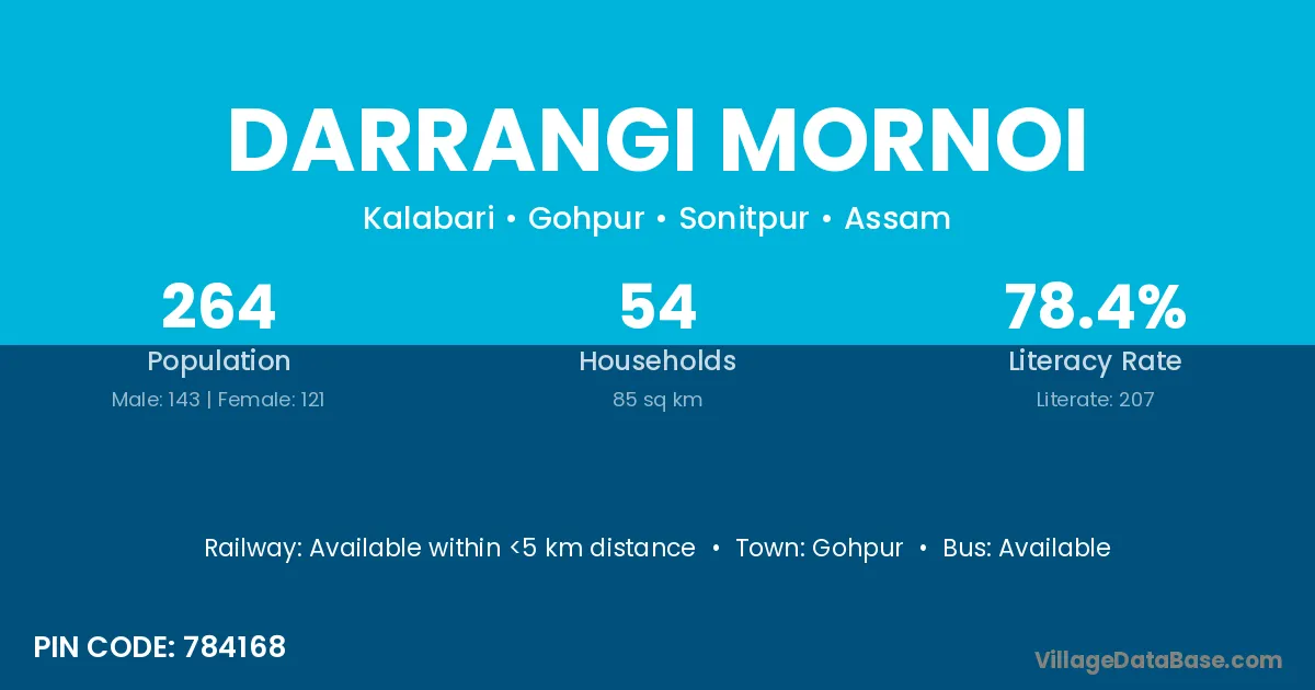 Darrangi Mornoi village has a total population of 264 people, of which 143 are males and 121 are females.