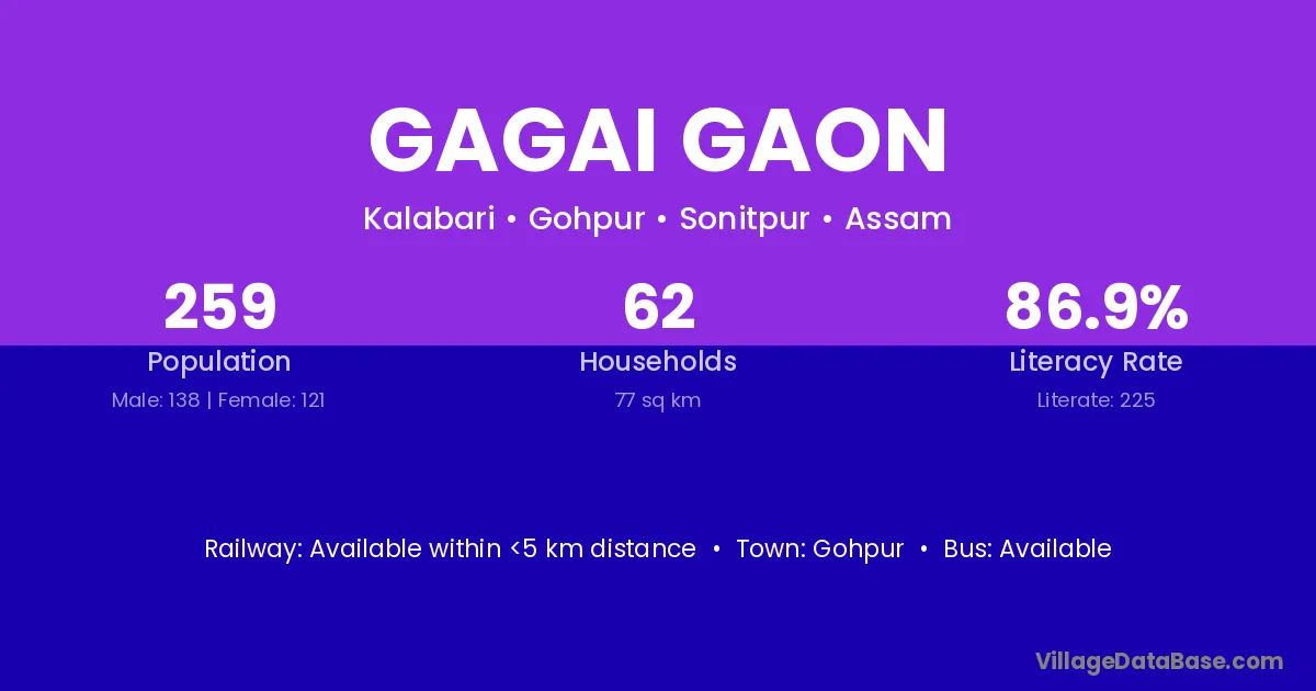 Gagai Gaon village has a total population of 259 people, of which 138 are males and 121 are females.