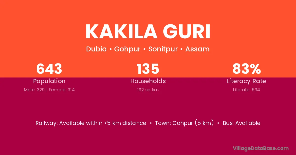 Gohpur (5 km) is the nearest town to Kakila Guri village for major economic activities and is located approximately 5 km away.