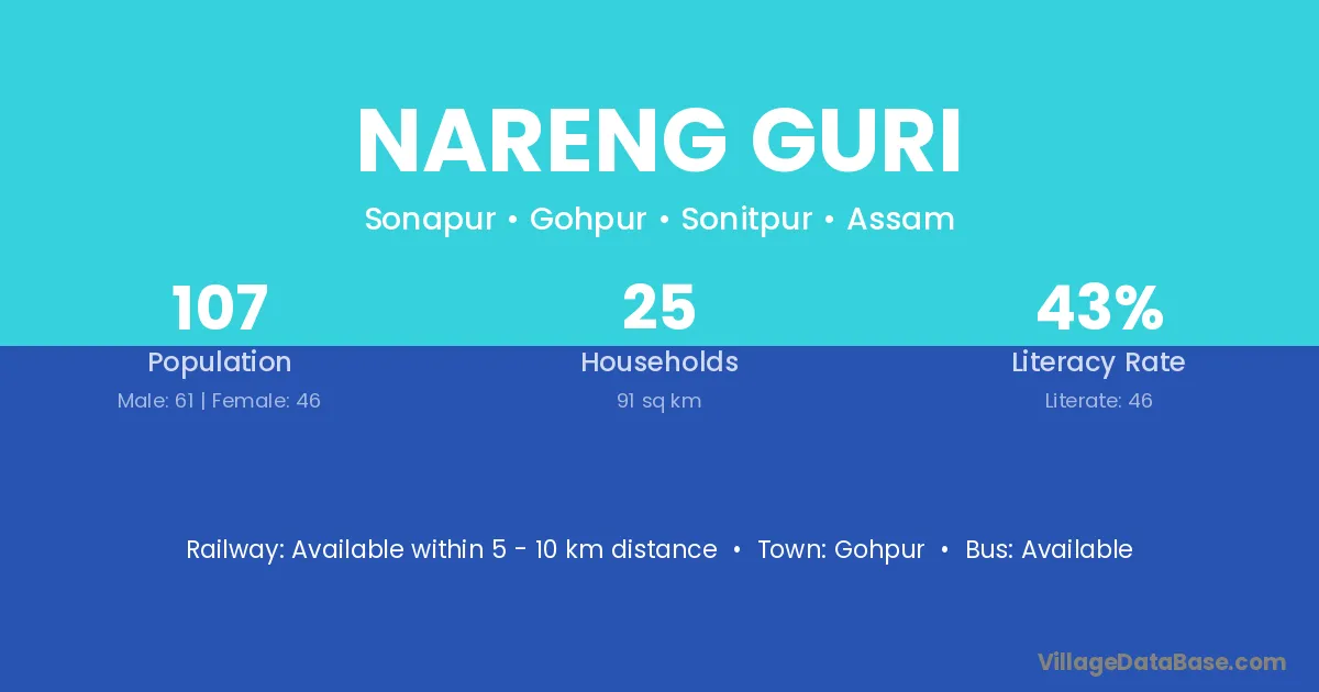 Nareng Guri village has a total population of 107 people, of which 61 are males and 46 are females.