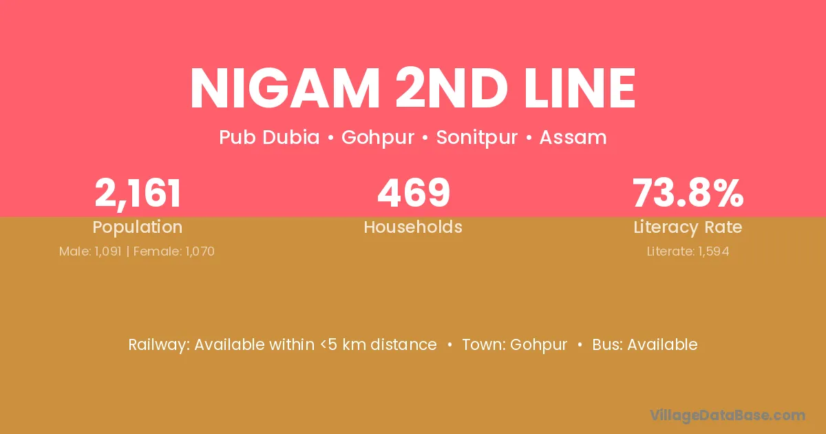 Nigam 2nd Line village has a total population of 2,161 people, of which 1,091 are males and 1,070 are females.