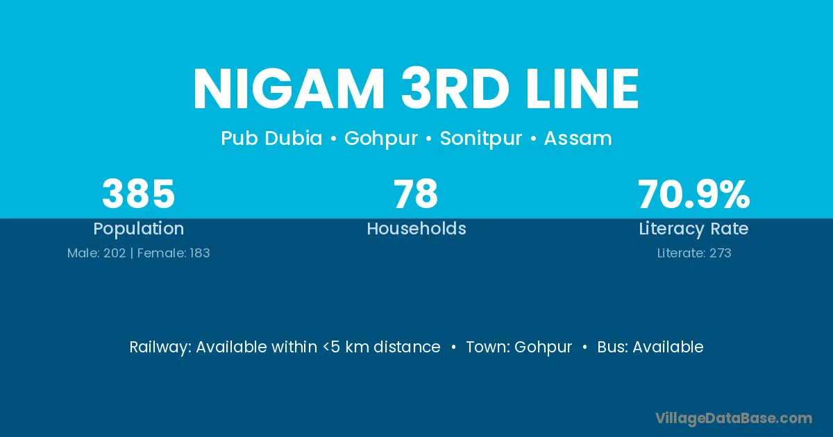 Nigam 3rd Line village has a total population of 385 people, of which 202 are males and 183 are females.