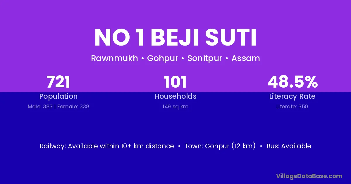 No 1 Beji Suti village has a total population of 721 people, of which 383 are males and 338 are females.