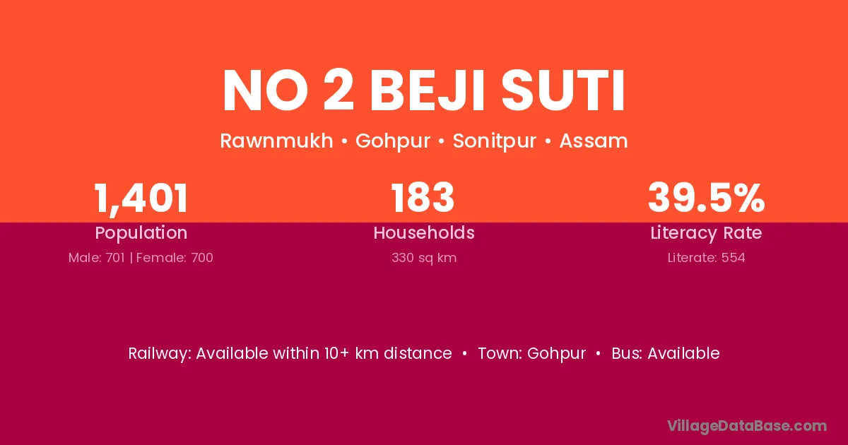 No 2 Beji Suti village has a total population of 1,401 people, of which 701 are males and 700 are females.