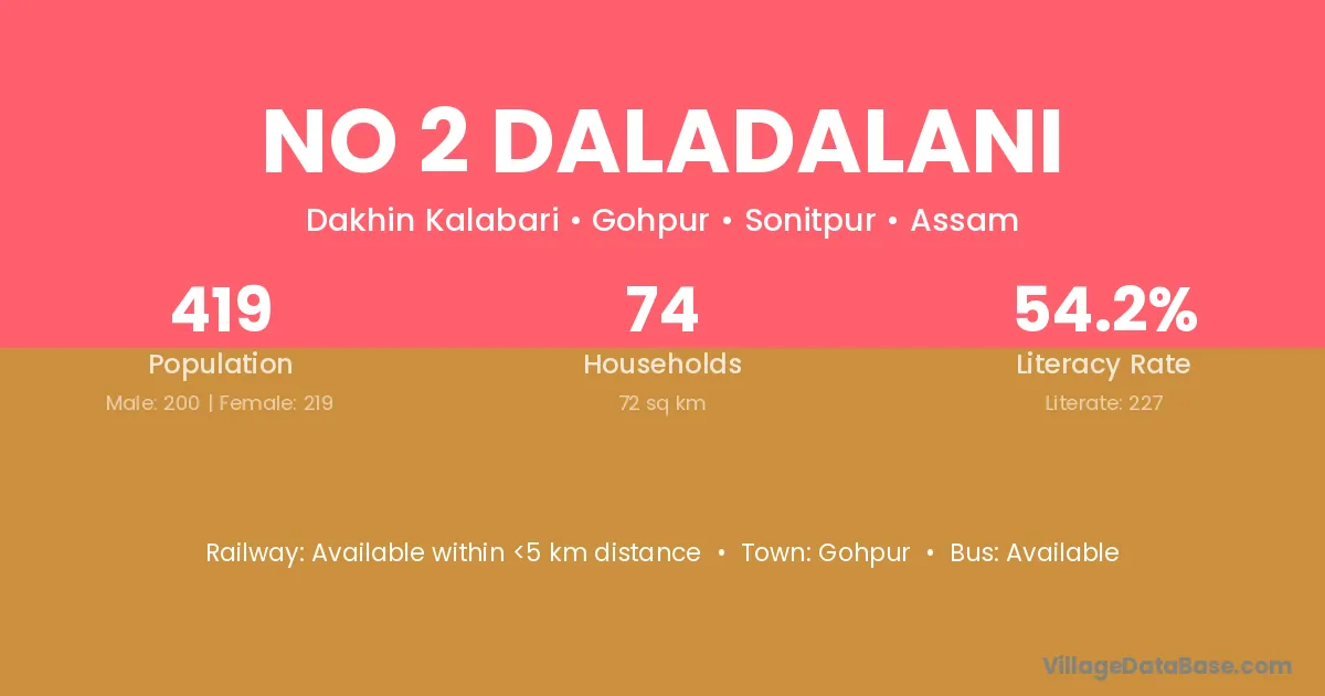 No 2 Daladalani village has a total population of 419 people, of which 200 are males and 219 are females.
