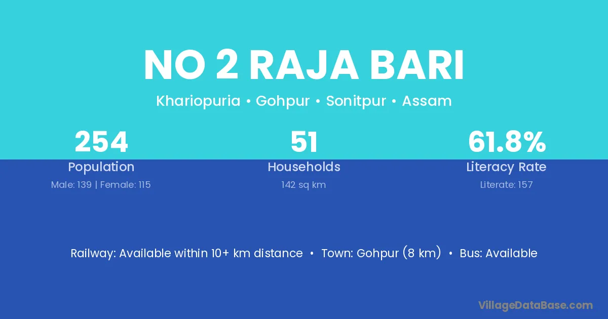 Gohpur (8 km) is the nearest town to No 2 Raja Bari village for major economic activities and is located approximately 8 km away.