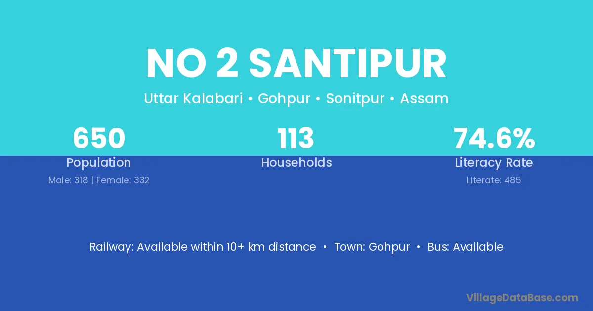 No 2 Santipur village has a total population of 650 people, of which 318 are males and 332 are females.