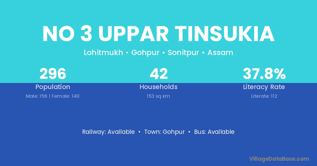 No 3 Uppar Tinsukia village has a total population of 296 people, of which 156 are males and 140 are females.