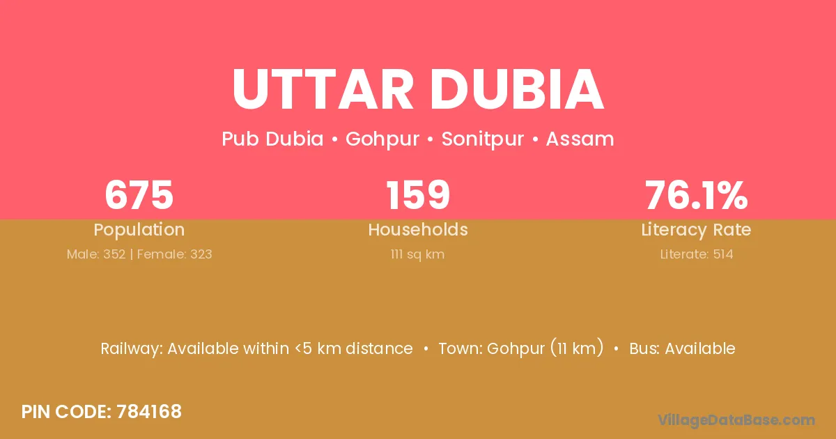 Gohpur (11 km) is the nearest town to Uttar Dubia village for major economic activities and is located approximately 11 km away.