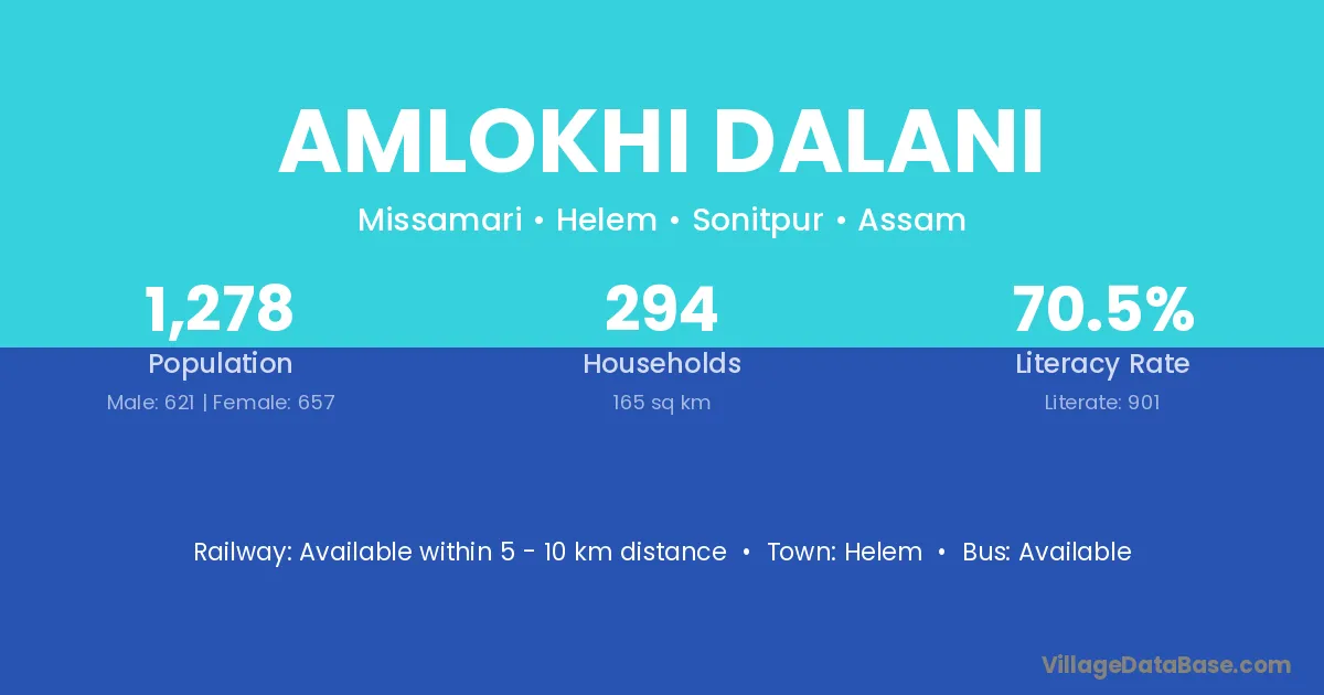 Amlokhi Dalani village has a total population of 1,278 people, of which 621 are males and 657 are females.
