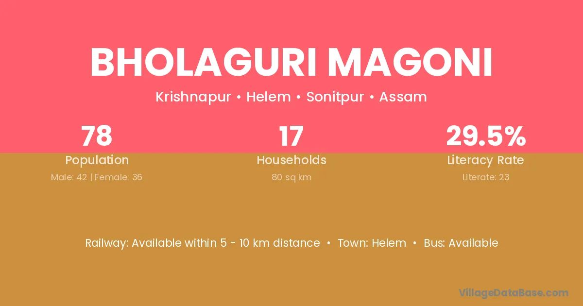 Bholaguri Magoni village has a total population of 78 people, of which 42 are males and 36 are females.