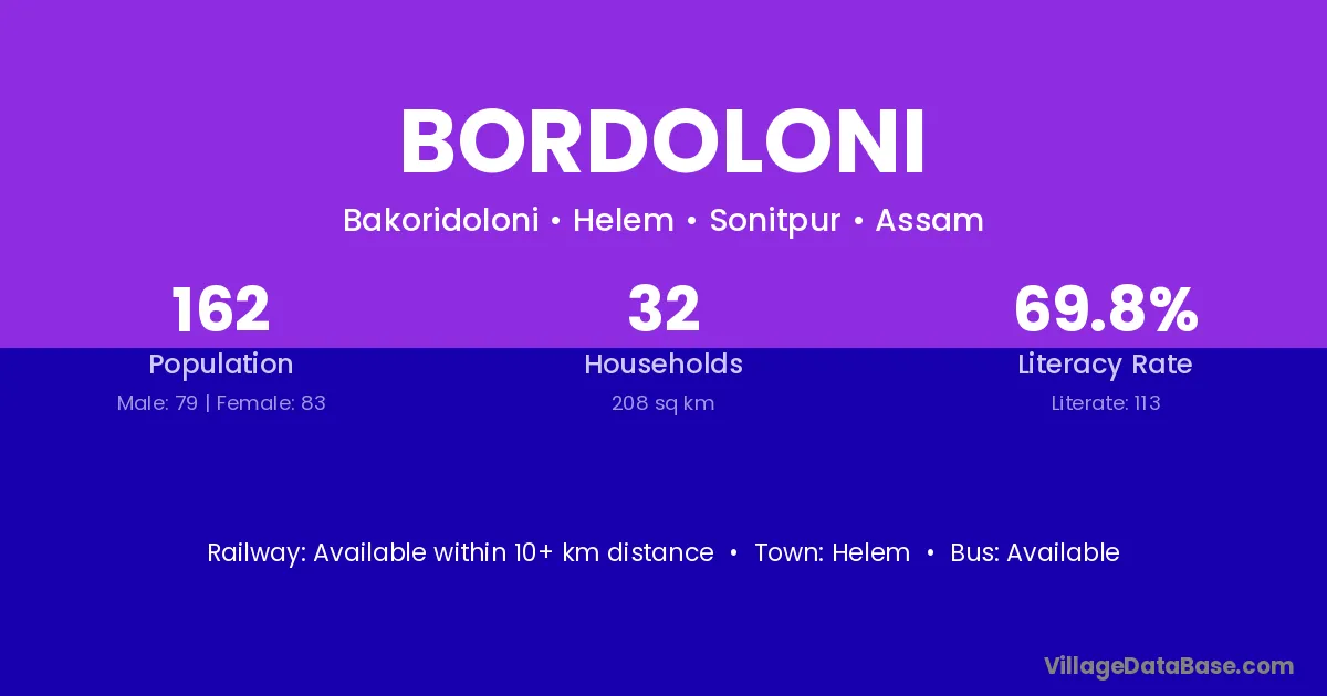The literacy rate of Bordoloni village is 69.75%. Male literacy stands at 77.22% and female literacy at 62.65%.