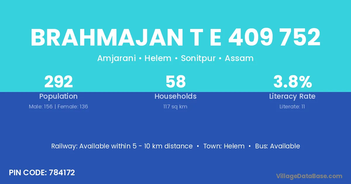 Brahmajan T E 409 752 village has a total population of 292 people, of which 156 are males and 136 are females.