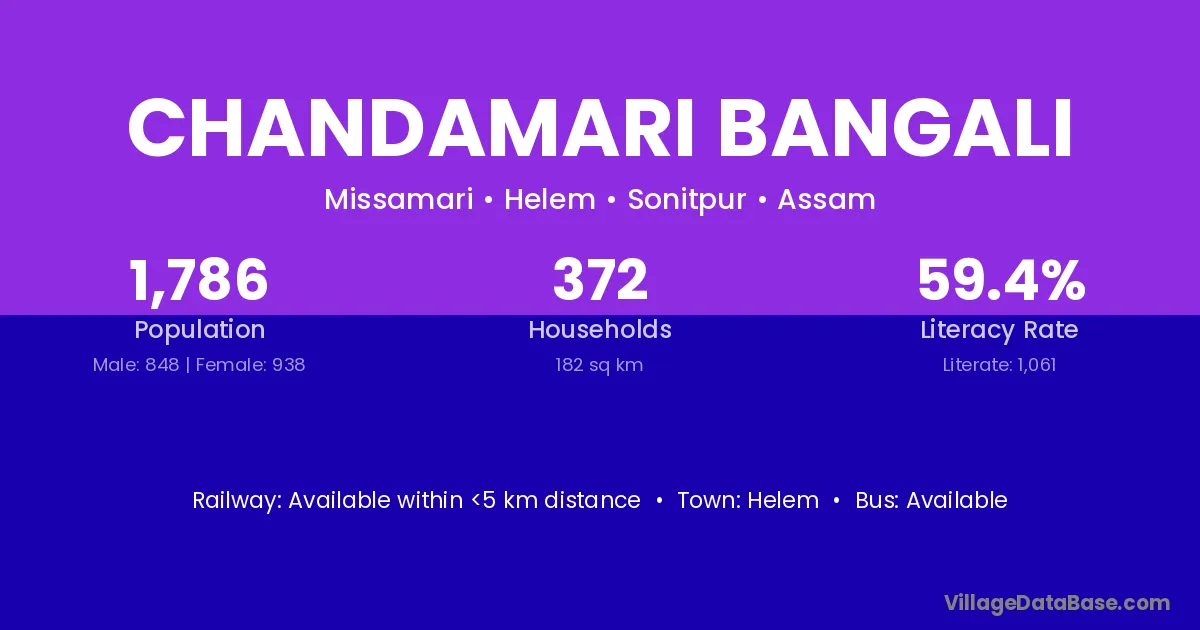 Chandamari Bangali village has a total population of 1,786 people, of which 848 are males and 938 are females.