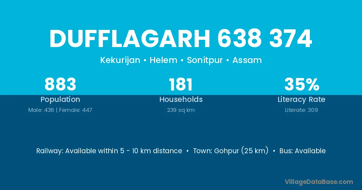 Gohpur (25 km) is the nearest town to Dufflagarh 638 374 village for major economic activities and is located approximately 25 km away.