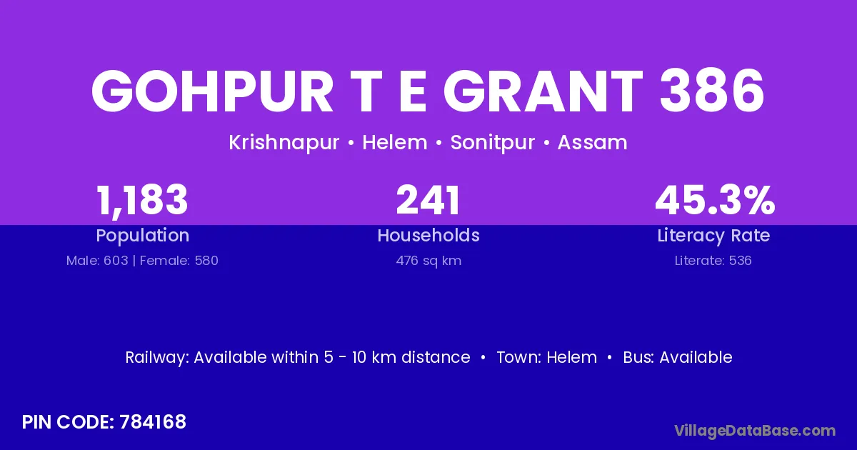 Gohpur T E Grant 386 village has a total population of 1,183 people, of which 603 are males and 580 are females.