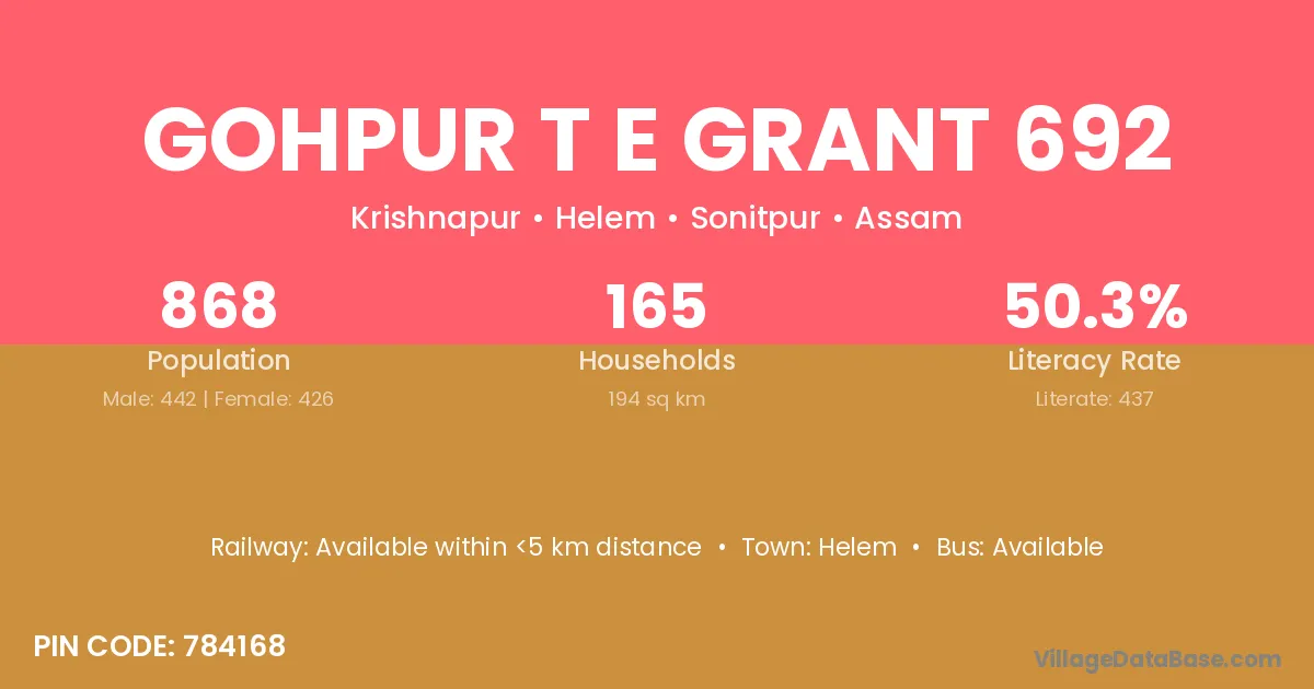 Gohpur T E Grant 692 village has a total population of 868 people, of which 442 are males and 426 are females.