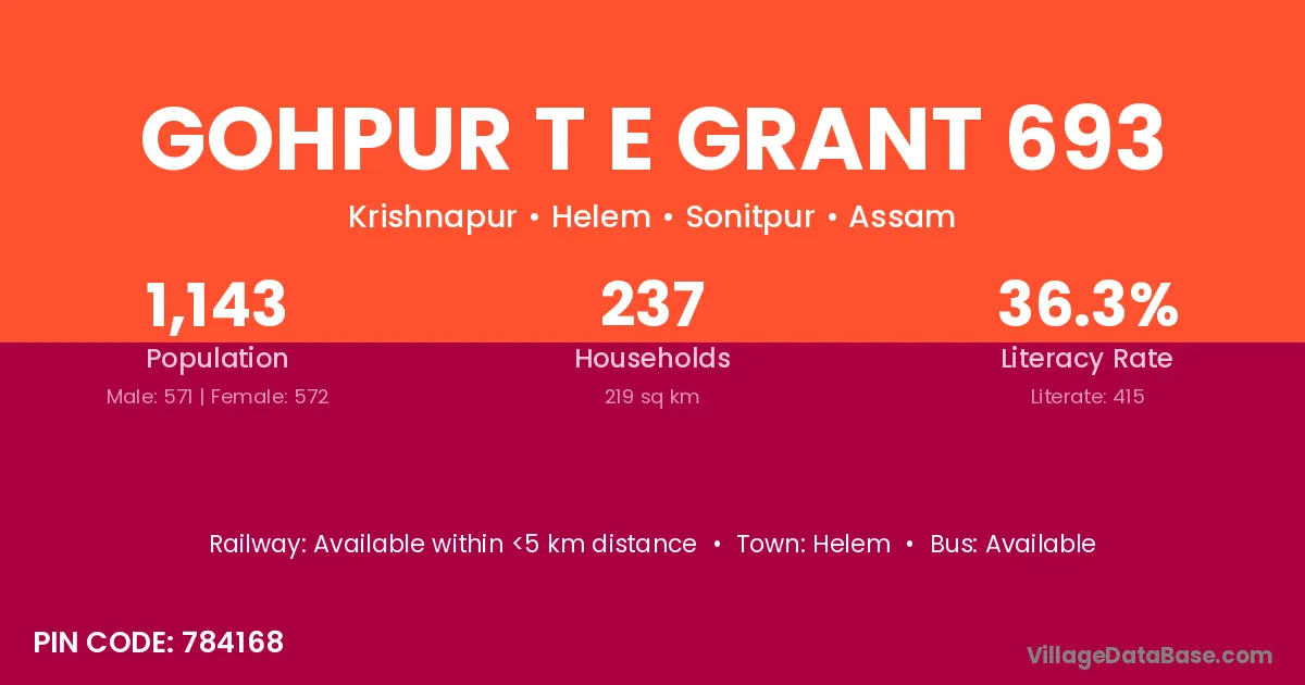 Gohpur T E Grant 693 village has a total population of 1,143 people, of which 571 are males and 572 are females.