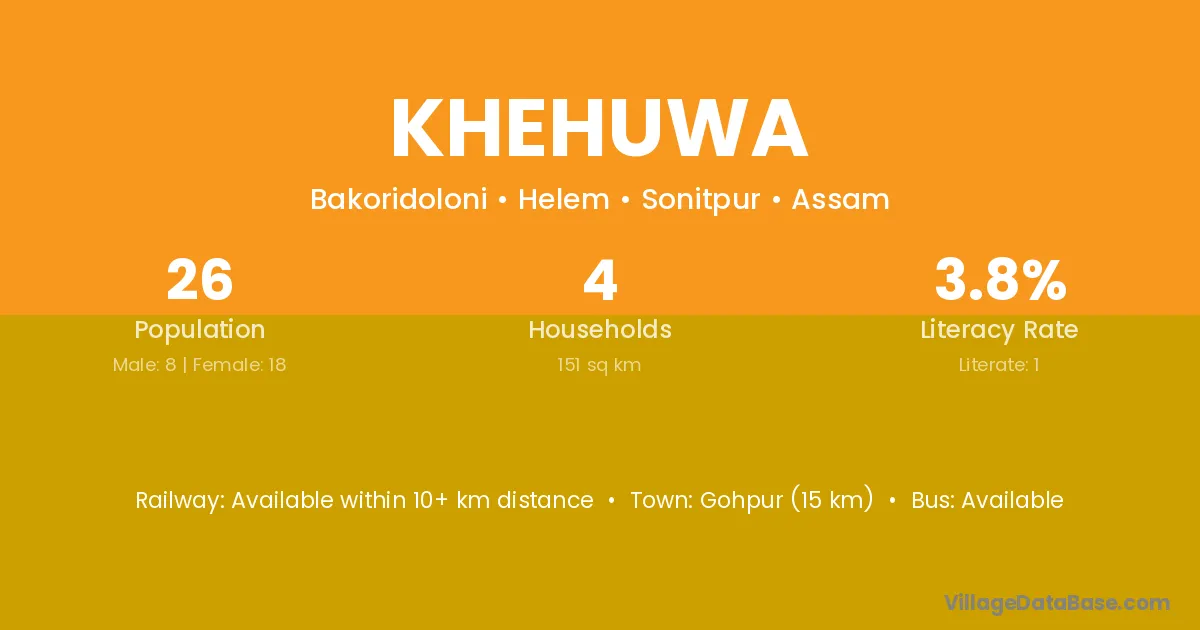 Gohpur (15 km) is the nearest town to Khehuwa village for major economic activities and is located approximately 15 km away.