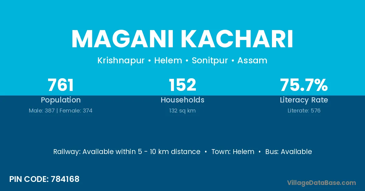Magani Kachari village has a total population of 761 people, of which 387 are males and 374 are females.