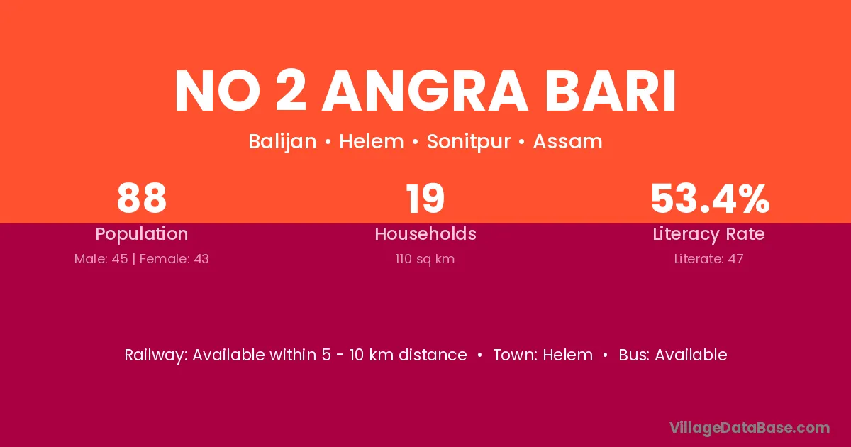 No 2 Angra Bari village has a total population of 88 people, of which 45 are males and 43 are females.