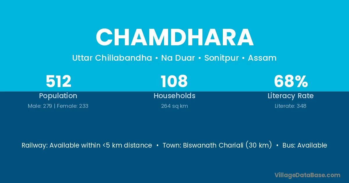 Biswanath Chariali (30 km) is the nearest town to Chamdhara village for major economic activities and is located approximately 30 km away.