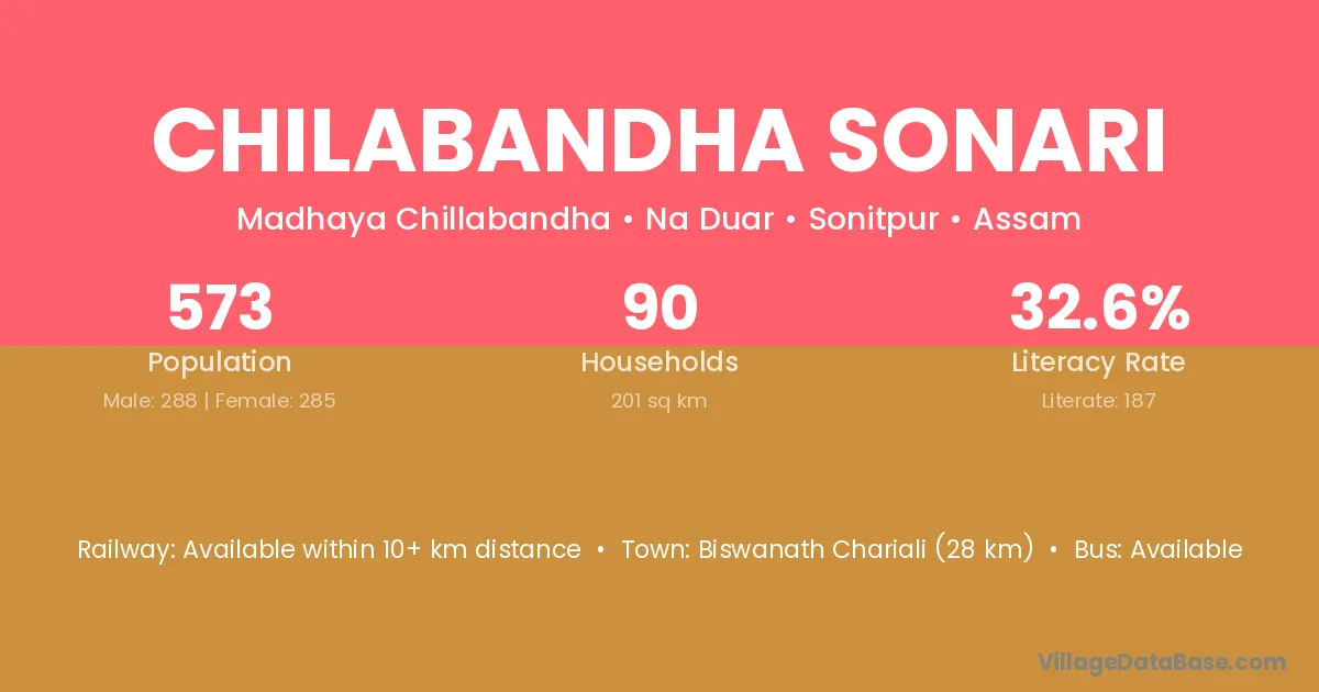 Biswanath Chariali (28 km) is the nearest town to Chilabandha Sonari village for major economic activities and is located approximately 28 km away.