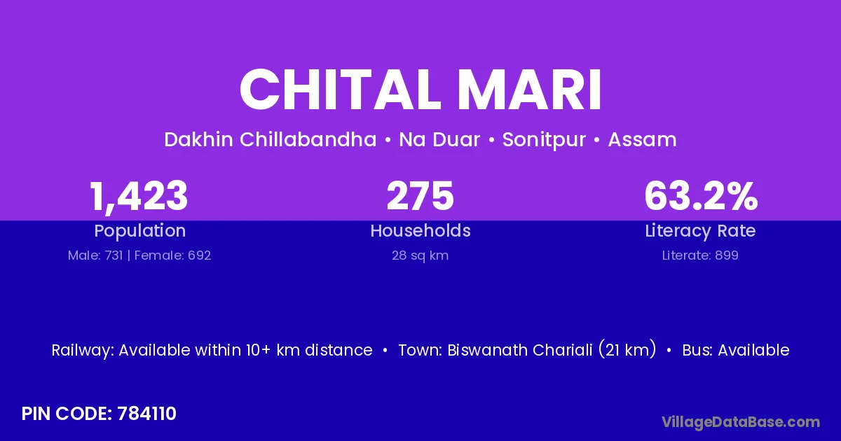 Biswanath Chariali (21 km) is the nearest town to Chital Mari village for major economic activities and is located approximately 21 km away.