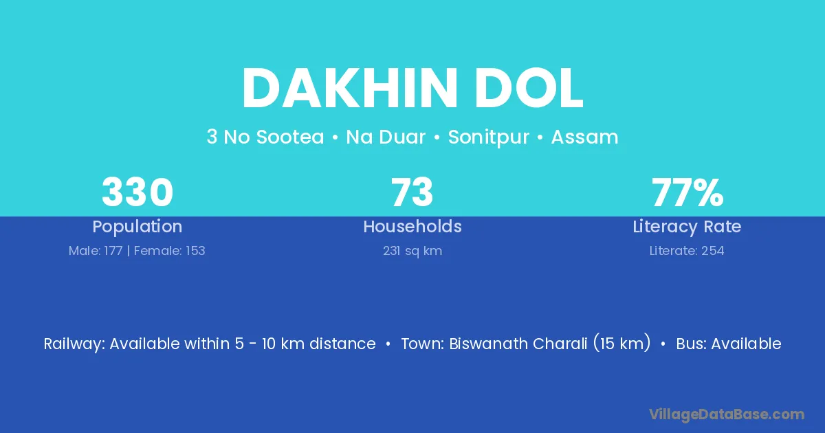 Biswanath Charali (15 km) is the nearest town to Dakhin Dol village for major economic activities and is located approximately 15 km away.