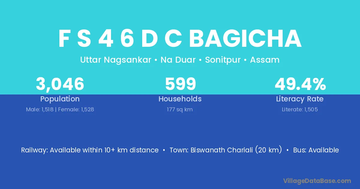 Biswanath Chariali (20 km) is the nearest town to F S 4 6 D C Bagicha village for major economic activities and is located approximately 20 km away.